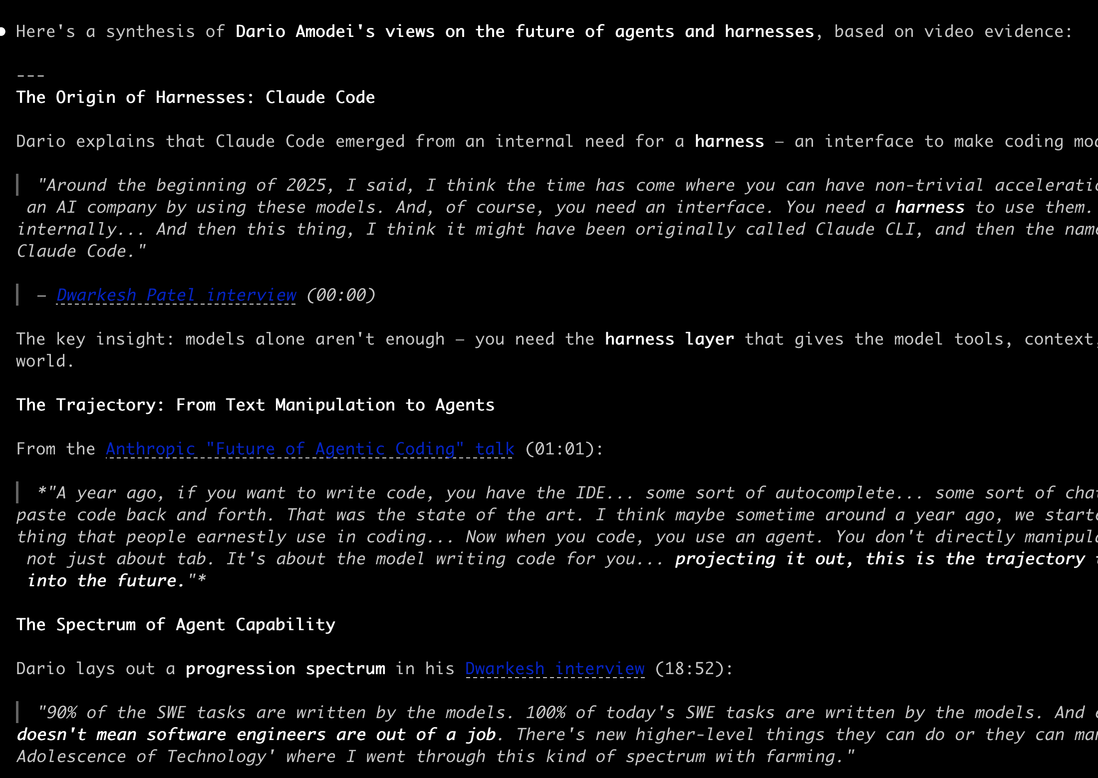Agent-generated research brief with bullet points, timestamps, and cerul.ai/v/ citations