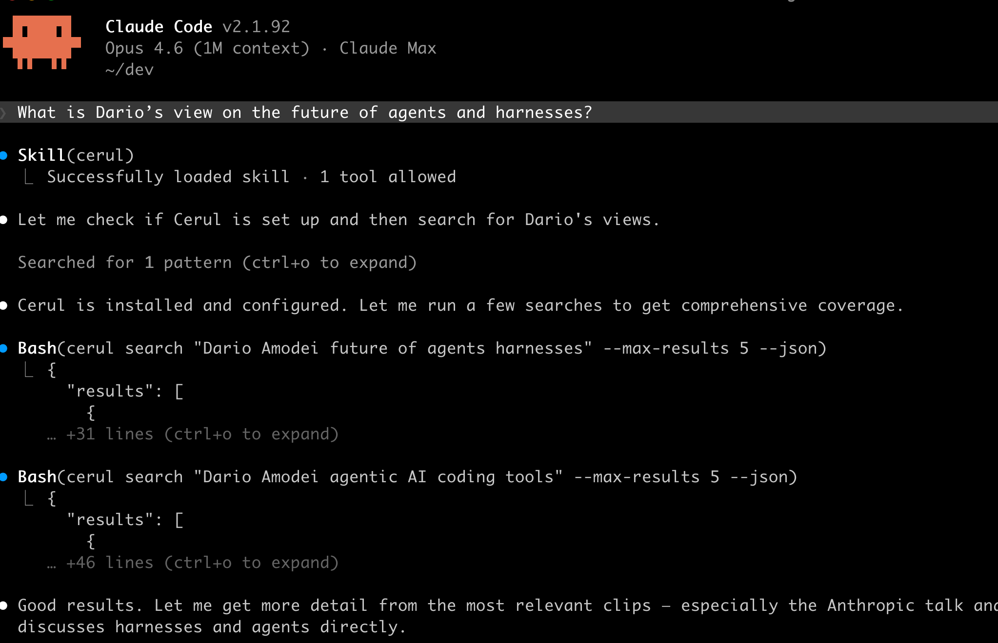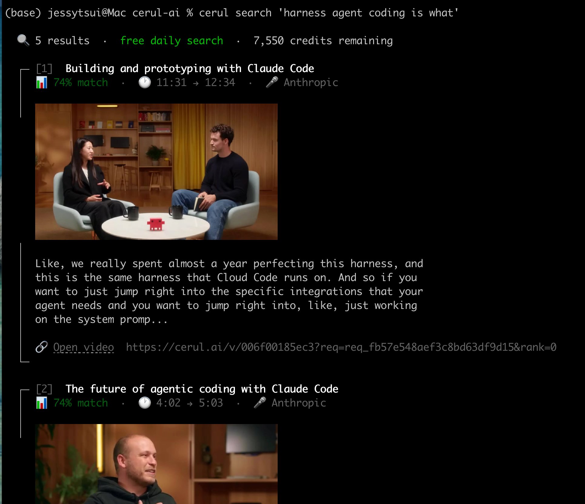 Shots of Cerul being used in the wild — inside the CLI, inside Claude Code as a skill, and inside a Telegram bot. Use these instead of marketing screenshots when you want to show what the developer experience actually looks like.