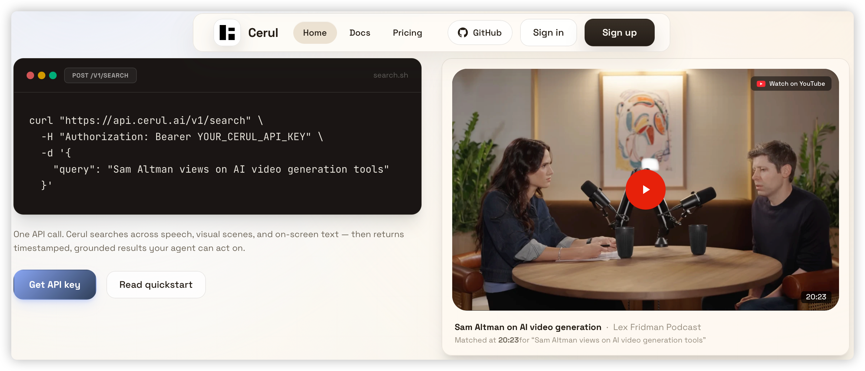 Cerul is the video search layer for AI agents — search video by meaning across speech, visuals, and on-screen text.