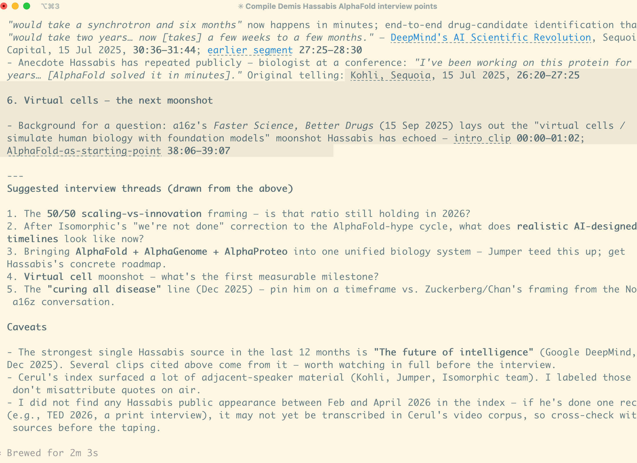 Claude Code (Opus 4.6) running the Cerul skill across multiple sub-topic searches to prep for a Demis Hassabis interview