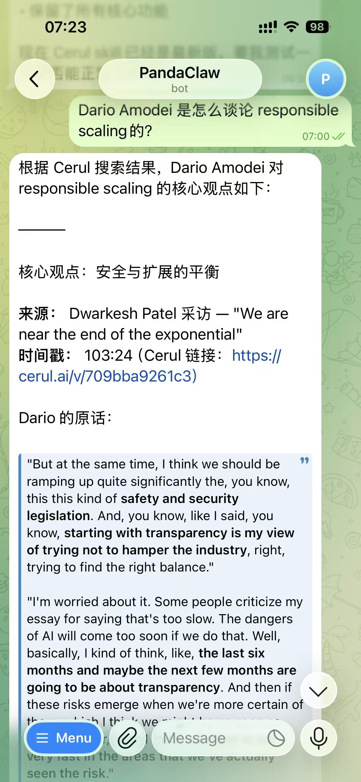 A Telegram bot powered by Cerul answering "How does Dario Amodei talk about responsible scaling?" with sourced video links